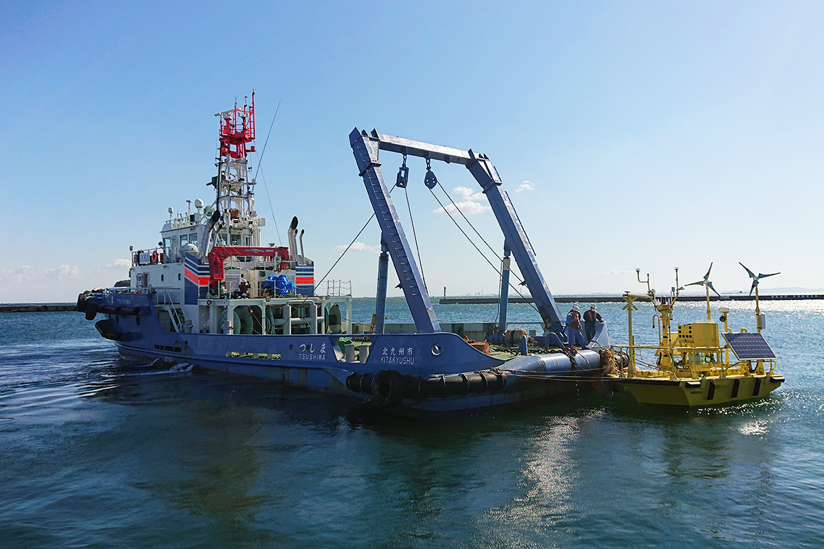 In recent years, demand for offshore wind power has surged due to global efforts to reduce carbon emissions. We have provided support for various offshore wind-related projects, including 3D acoustic surveys, towing of Self-Elevating Platform (SEP) vessels, and route clearing work to remove abandoned fishing gear and debris from the seafloor prior to the installation of subsea power cables. In terms of specific projects, a Dokai vessel towed the SEP vessel used for the installation and removal of wind turbines at a demonstration site off the coast of Hibikinada, Kitakyushu City.