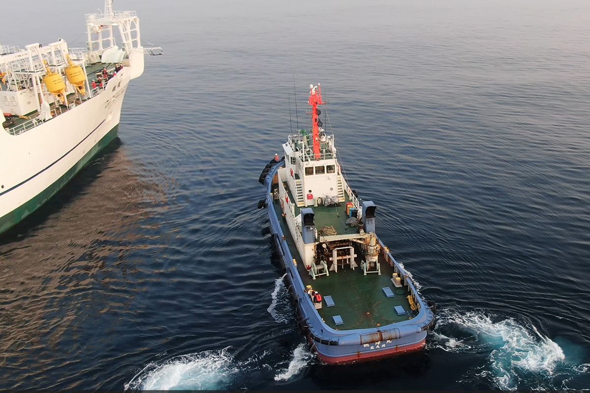 Dokai tugs serve as guard vessels when large work vessels, such as research vessels and cable-laying vessels, conduct offshore operations in the waters around Japan. By vigilantly monitoring the work area and alerting passing vessels that operations are in progress, we help ensure that these large work vessels can carry out their tasks safely and with minimal interruption.