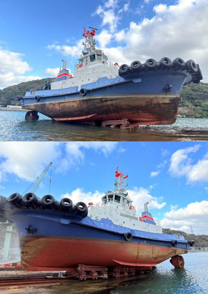 年明けにさくらの定期検査がありました。若松では普段左舷付けしており、右舷側には日光がより多く当たるため、右舷と左舷で汚れ具合が違っていました。